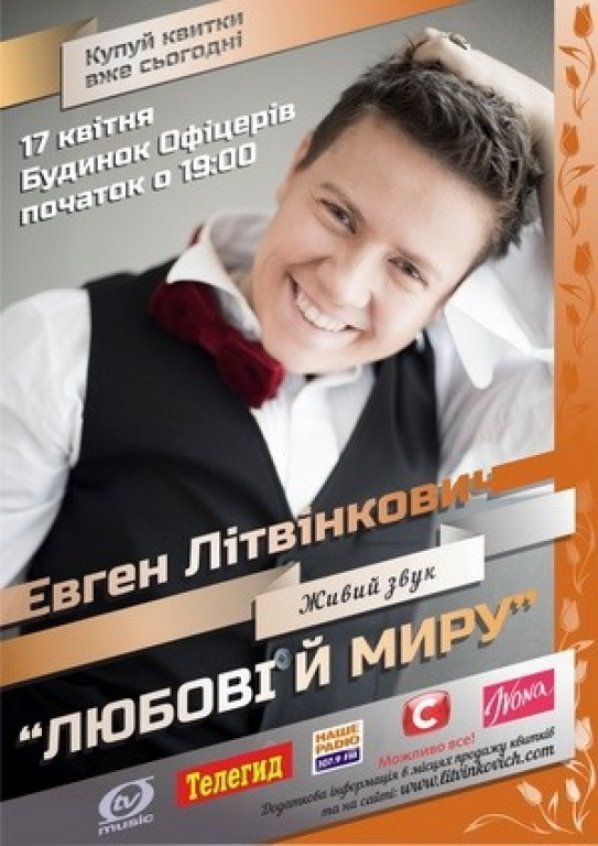 Каждая встреча Евгения Литвинковича с поклонниками – это не просто концерт. Это разговор по душам, это невероятная атмосфера человеколюбия, домашнего уюта и острого юмора. Новая концертная программа «Любви и мира» включает в себя как хорошо известные и полюбившиеся авторские синглы Евгения Литвинковича из альбомов «К тебе» и «Здесь и сейчас», так и целый ряд концертных номеров, которые артист не показывал на сцене со времен его участия в популярных талант-шоу. На это обязательно стоит посмотреть. Не обойдется и без сюрпризов, о которых Евгений Литвинкович пока умалчивает. Артист обещает сделать все возможное, чтобы концерты «Любви и мира» запомнились поклонникам надолго, став настоящим весенним праздником!