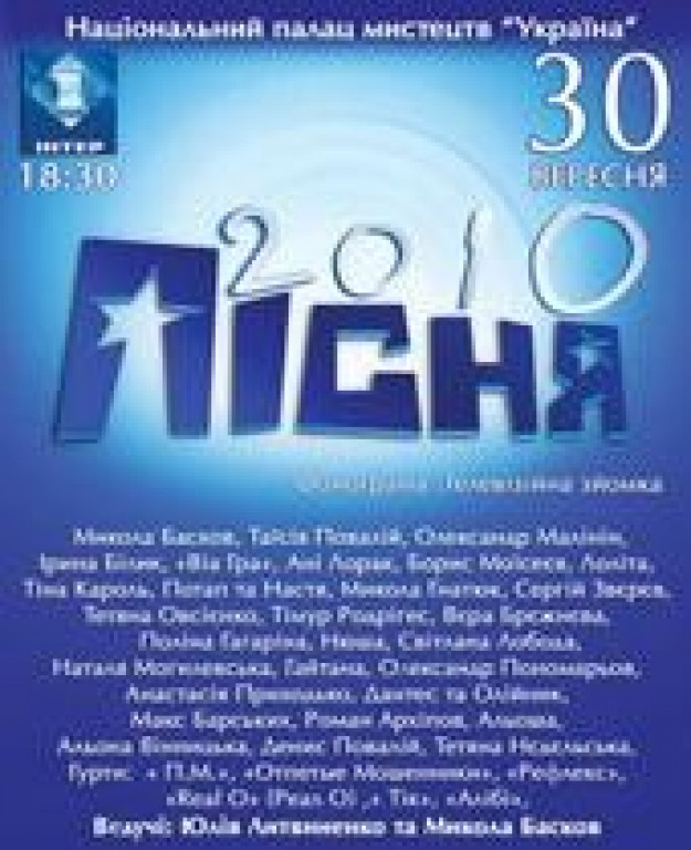 Большой концерт "ПЕСНЯ года 2010" состоится в Национальном Дворце Украина 30 сентября 2010 г. На концерте выступают Николай Басков, Таисия Повалий, Александр Малинин, Ирина Билык, группа ВИА ГРА, Ани Лорак, Борис Моисеев, Лолита, Тина Кароль, Потап и Настя, Николай Гнатюк, Сергей Зверев, Татьяна Овсиенко, Тимур Родригес, Вера Брежнева, Полина Гагарина, Нюша, Светлана Лобода, Наталья Могилевская, Александр Пономарев, Анастасия Приходько, Гайтана, Дантес и Олейник, Макс Барских, Алеша, Алена Винницкая, Татьяна Недельская, Роман Охрипов, Денис Повалий, группы "П.М.", "Отпетые Мошенники", "Рефлекс", "Реал О", "ТИК", "Алиби".