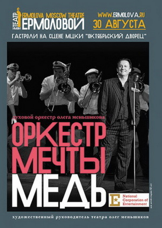 30 августа 2013-того года в Октябрьском дворце пройдут гастроли театра Ермоловой. В рамках которых киевляне и гости столицы смогут посмотреть спектакль-концерт «Оркестр мечты. Медь», в качестве режиссёра-постановщика которого выступил знаменитый российский актёр Олег Меньшиков. За хореографию в нём отвечает Егор Дружинин, а дирижером является Денис Виноградов. Купить билеты на спектакль «Оркестр мечты. Медь» вы можете на нашем сайте уже сегодня.