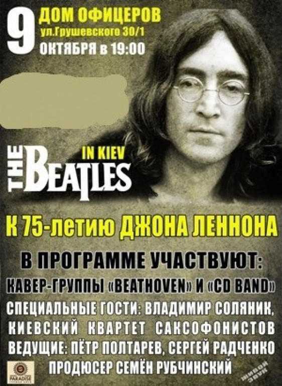 Украинские музыканты решили отметить 75 летие Джонна Леннона по своему. Лучшие киевские кавер – группы Beathoven и CD band, великолепно исполняющие песни The Beatles и Леннона, блестящий джазовый пианист импровизатор Владимир Соляник и лауреат международных фестивалей в Италии, Франции, Германии и Канаде – «Киевский квартет саксофонистов» под руководством Юрия Василевича – доставят украинским фанам The Beatles море удовольствия, добавив к любимым, с детства знакомым, песням свою энергетику и драйв!