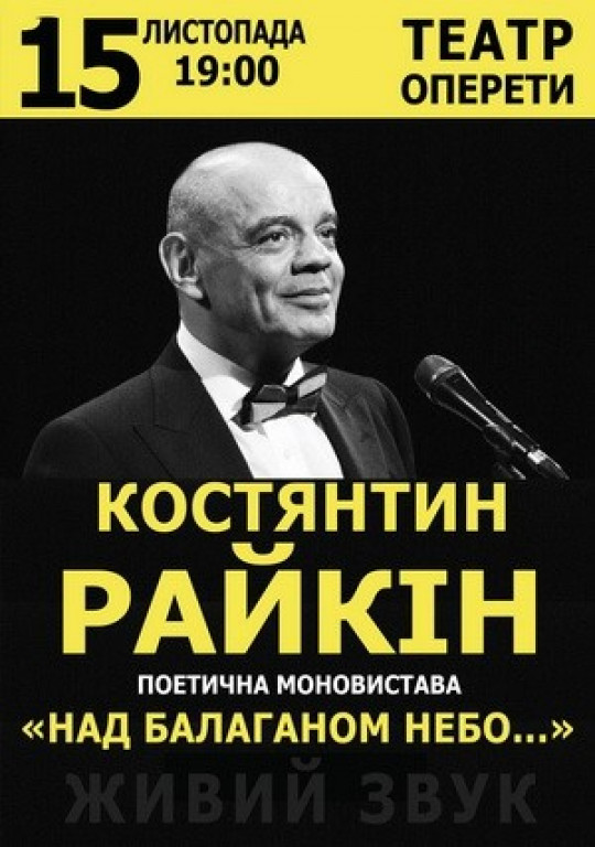 Концерт «Над балаганом неба» Константина Райкина в Киеве это уникальный поэтический моно спектакль, в котором артист остается наедине с публикой, при этом открывая пугающий ящик Пандоры, полный сокровенных тем, неких секретов и волнительных эмоций. Живое общение со зрителями всегда выделяло Константина Аркадьевича, а его умение искусно сплетать иронию, комедию и трагедию, наполненную драматизмом, воедино создает завораживающий перформанс, увлекающий в переплетение переживаний и чувств. Не упустите возможность испытать невероятное эстетическое наслаждение.