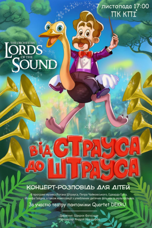 7 листопада о 17:00 в Палаці Культури КПІ (проспект Перемоги, К7 37) спеціальна програма для маленьких глядачів від оркестру Lords of the Sound. «Від Страуса до Штрауса» - концерт-розповідь для дітей від 5 років.