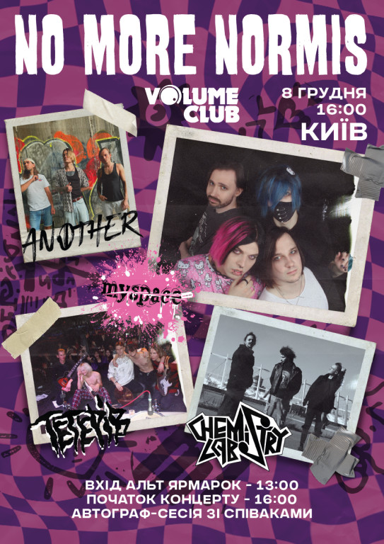 Готуйтеся до незабутнього вечора! Концерт NO MORE NORMIS збере разом сучасних представників емо, гранж і панк сцени в Україні. На сцені спільно виступлять культові гурти MySpace (зі свіжим EP), Another, Chemistry Lab та Тетерів. Відчуйте енергетику живої музики, яка об’єднає шанувальників альт-культури та рок-звучання.