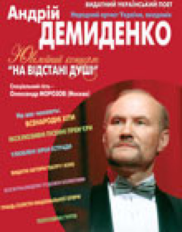 17 декабря 2011 во Дворце Украина известный украинский поэт, Народный адтист Украины, академик Андрей Демиденко приглашает Вас на творческий вечер. Специальный гость - Александр Морозов (Москва). На концерте будут: всенародные хиты, эксклюзивные песенные премьеры, любимые звезды эстрады, известные актеры театра и кино, гранд-солисты национальной оперы, популярные группы.